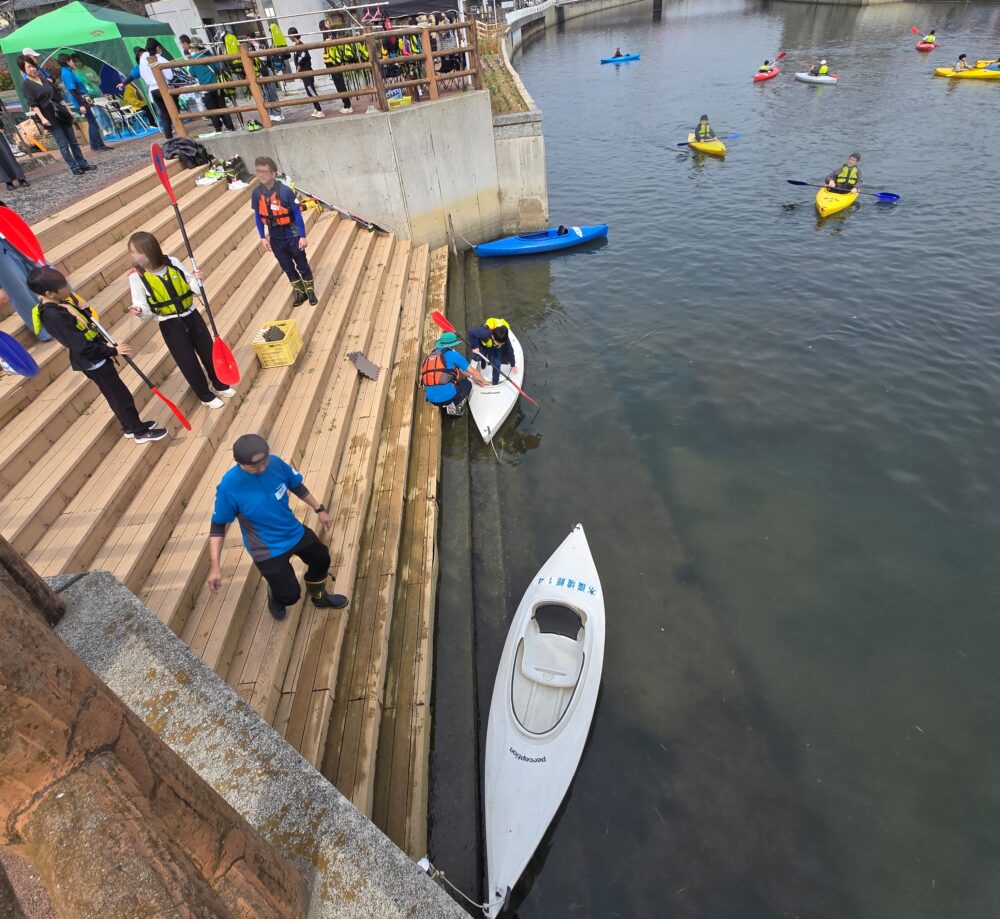 金山川の一番奥では『カヌー』乗り場ができています。毎年ここにカヌーの乗り場が作られています。余程小さい子供でなければ、1人で子供は乗っています。犬を連れて乗っている人も多いですね。もちろん、「救命具」などは無料で貸してくれます。