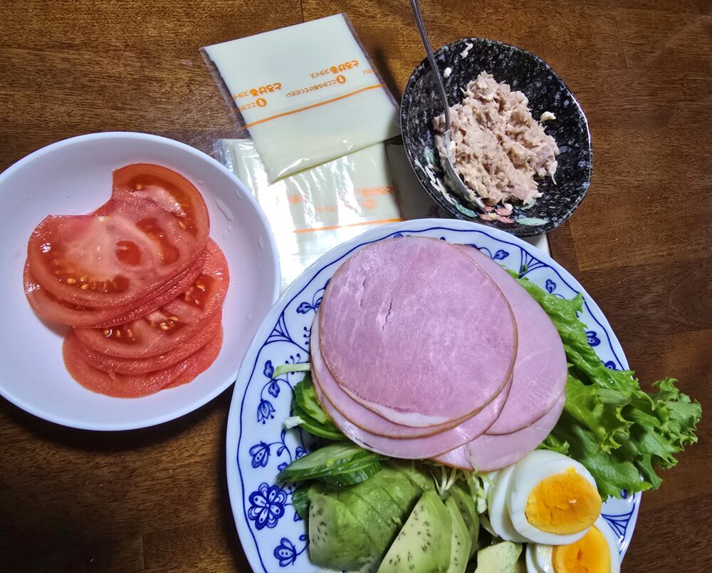 一度焼いた【トルティーヤ】をトースターで軽く焼いて<ハム&溶けるチーズ>をのせて全て焼きます。トッピングは下記のように準備しました。