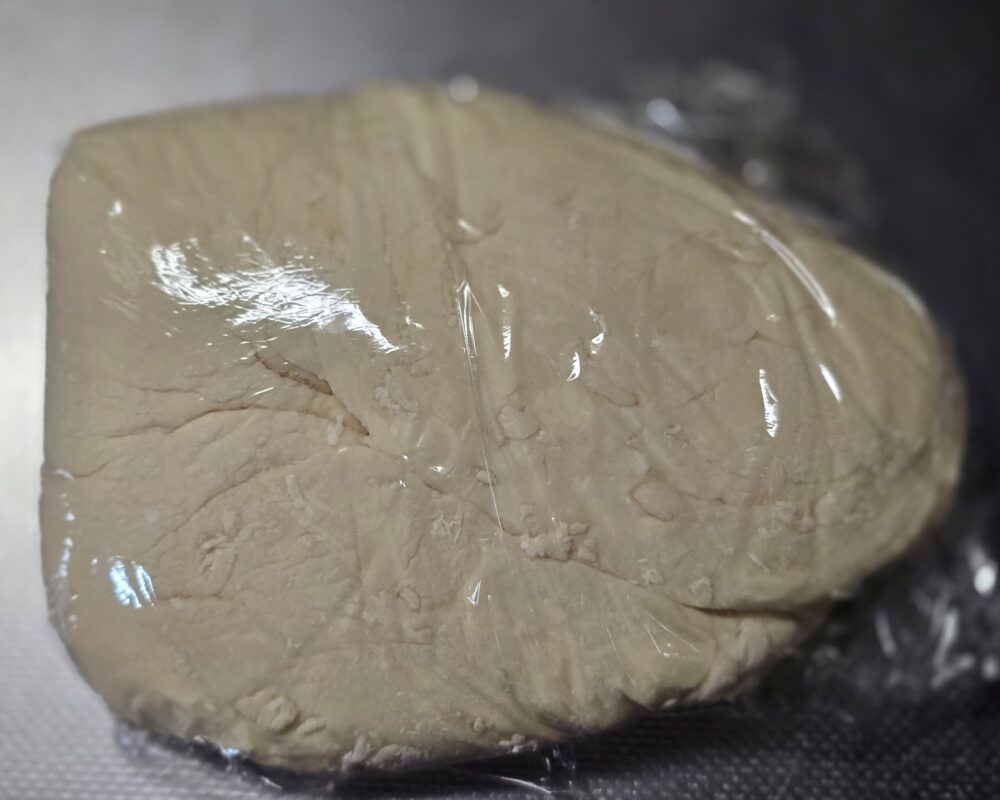 ある程度までこねることができたら、ラップで少しくるみ(30分くらい)おいておきます。果たしてこれが効果があるのかはわかりませんが。 全く違いがわかりませんでしたが。