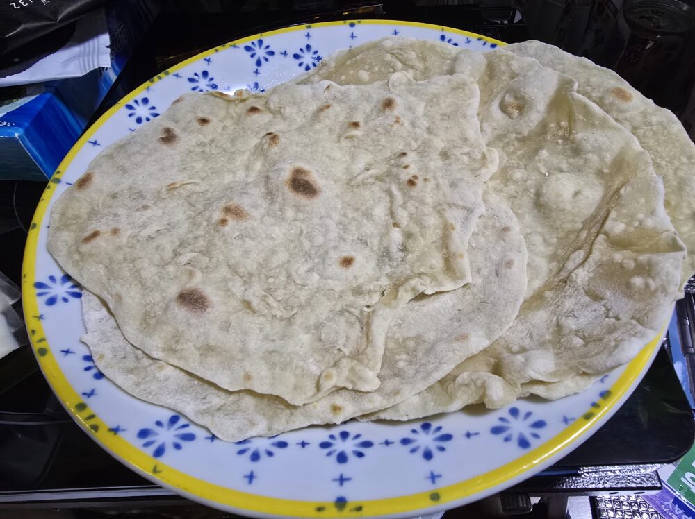 総計:300gの中力粉・強力粉からは22センチくらいに伸ばした【トルティーヤ】が5枚取れました。
