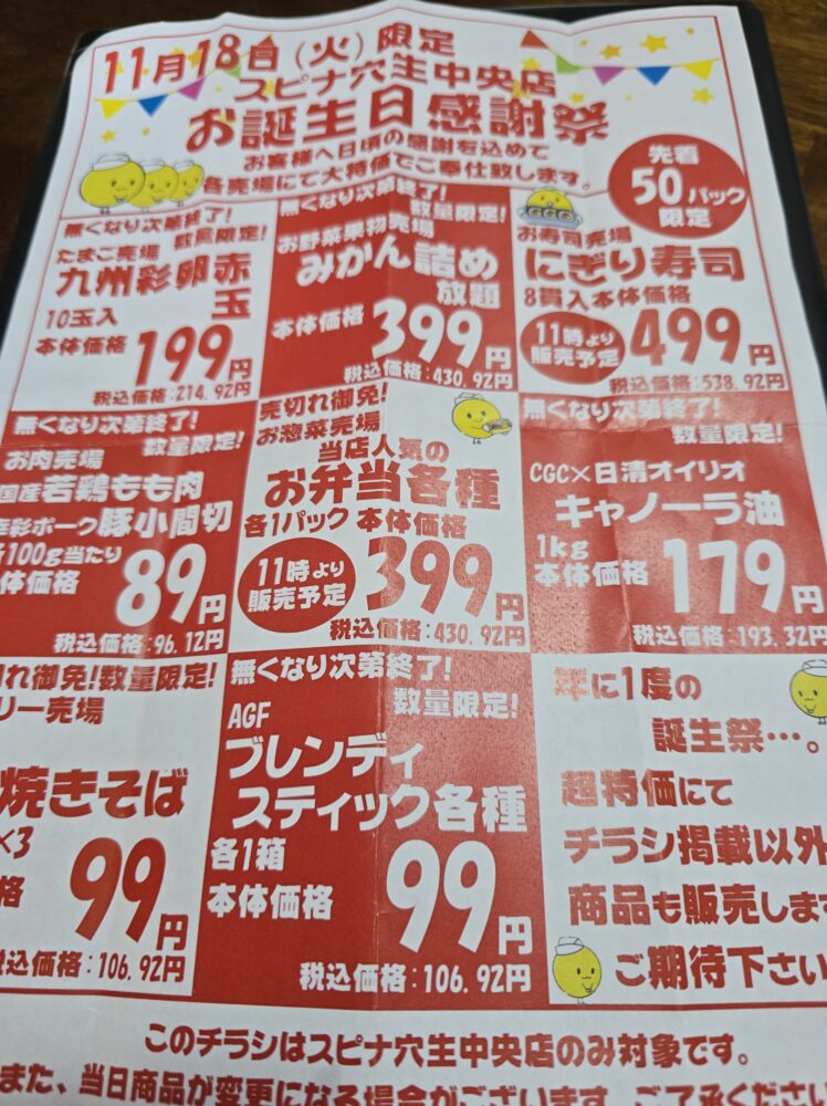 11月18日(火) 私の地元の北九州市八幡西区の西鉄系の【スピナ】という食品スーパーです。