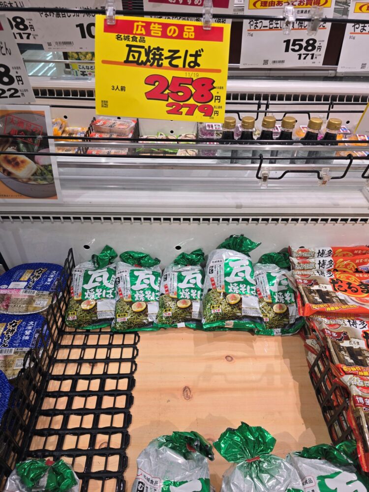 【瓦焼きそば】の文化は山口県の物ですが、北九州でもとても人気が高く、写真の【瓦焼きそば】はどこのスーパーでも必ず置いている商品です。好きな人はとても多く、今回のセールでも個数制限などが無いため、この商品を6つ友達の分も買ってしまいました。